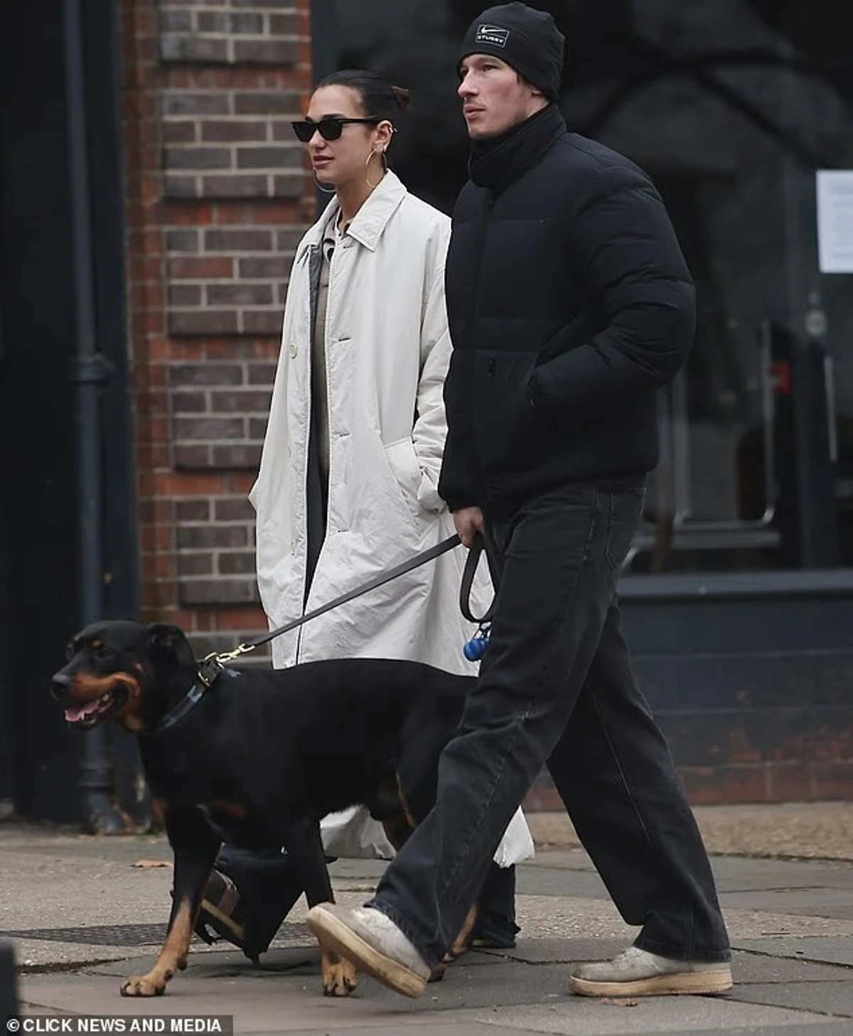 Dua u shfaq elegante si gjithmonë me një pallto trench ngjyrë krem dhe syze dielli, ndërsa Callum ishte veshur trashë me një xhaketë të zezë dhe kapele.
