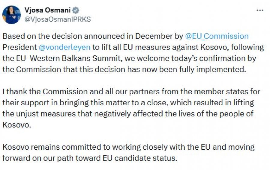 Presidentja e Kosovës, Vjosa Osmani, ka mirëpritur konfirmimin e Komisionit Evropian për zbatimin e plotë të vendimit për heqjen e të gjitha masave të Bashkimit Evropian ndaj Kosovës. Me anë të një postimi në “X”, Osmani theksoi se ky vendim ishte paralajmëruar që në dhjetor nga Presidentja e Komisionit Evropian, Ursula von der Leyen, pas Samitit BE–Ballkani Perëndimor.