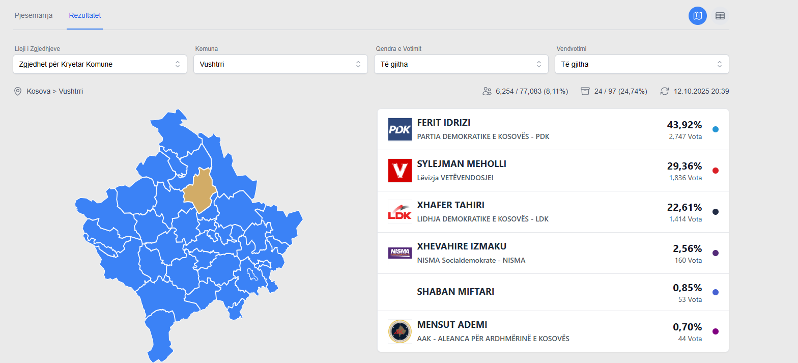 Komisioni Qendror i Zgjedhjeve ka numëruar mbi tetë për qind të votave në Komunën e Vushtrrisë. Nga 8,11 për qind të votave të numëruara, PDK prin me Ferit Idrizin me 43,92 për qind të votave.