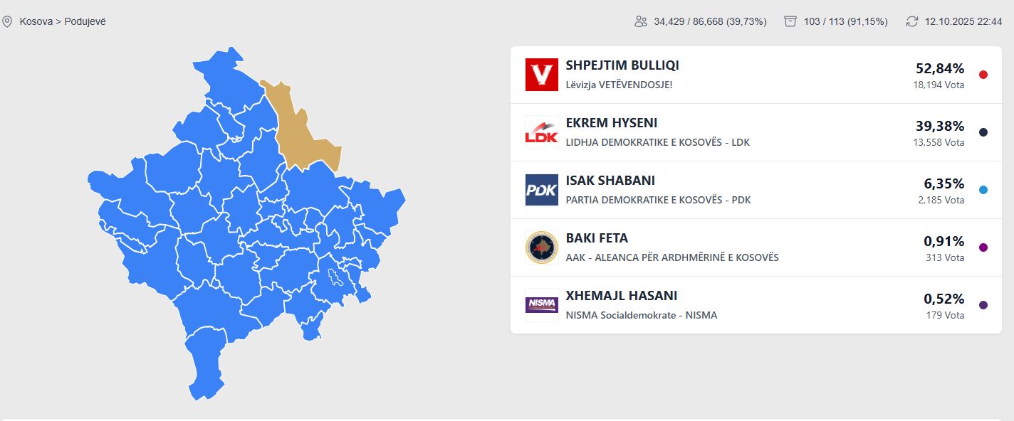Kandidati i Lëvizjes Vetëvendosje për kryetar të Podujevës, Shpejtim Bulliqi, është drejt fitores pa balotazh edhe për një mandat në krye të komunës. Nga 39.73 për qind të votave të numëruara, Bulliqi prin me 52.84 për qind apo 18 mijë e 194 vota.
