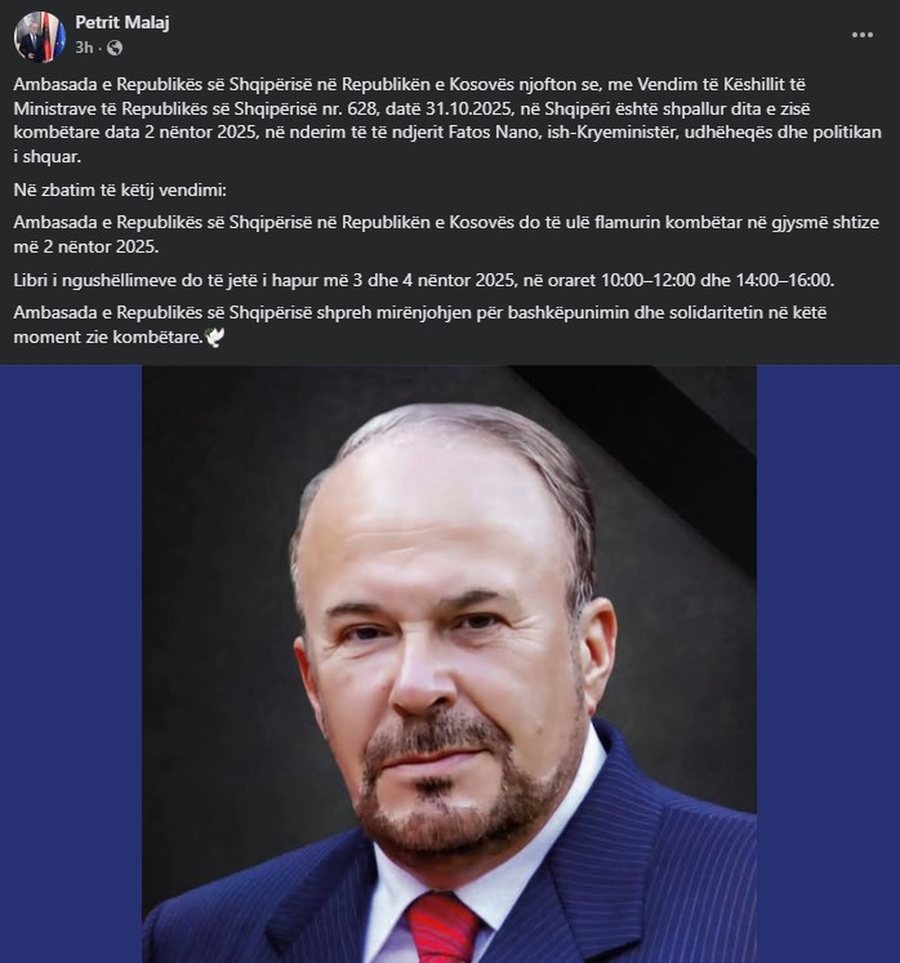 “Ambasada e Republikës së Shqipërisë në Republikën e Kosovës njofton se, me Vendim të Këshillit të Ministrave të Republikës së Shqipërisë nr. 628, datë 31.10.2025, në Shqipëri është shpallur dita e zisë kombëtare data 2 nëntor 2025, në nderim të të ndjerit Fatos Nano, ish-Kryeministër, udhëheqës dhe politikan i shquar.