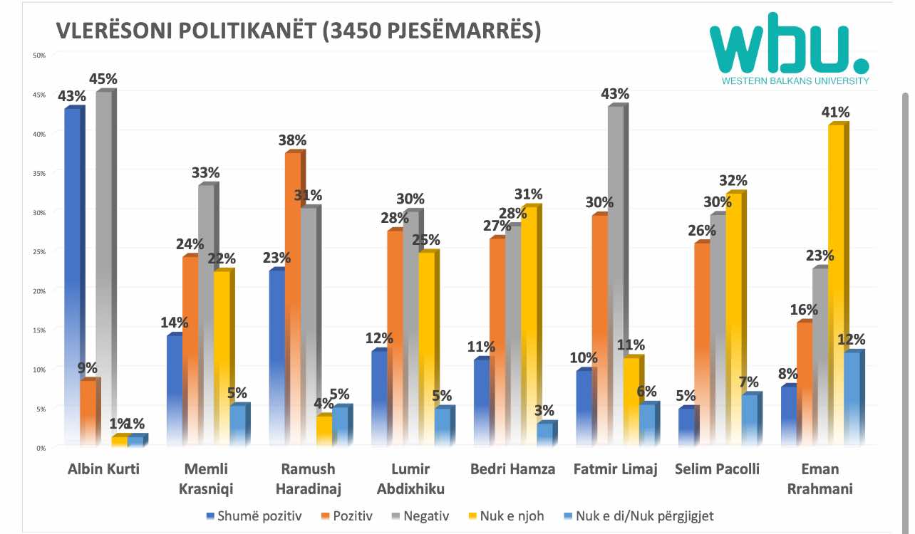 “I pari në këtë kategori për kotnradiktën në vete është emri i Albin Kurtit, sepse Albin Kurti 52% që e shikojnë pozitiv, por është 45% që e shikonë më negative. Pra është shumë polarizues. Nuk ka mes, o e duan o e urrejnë”.