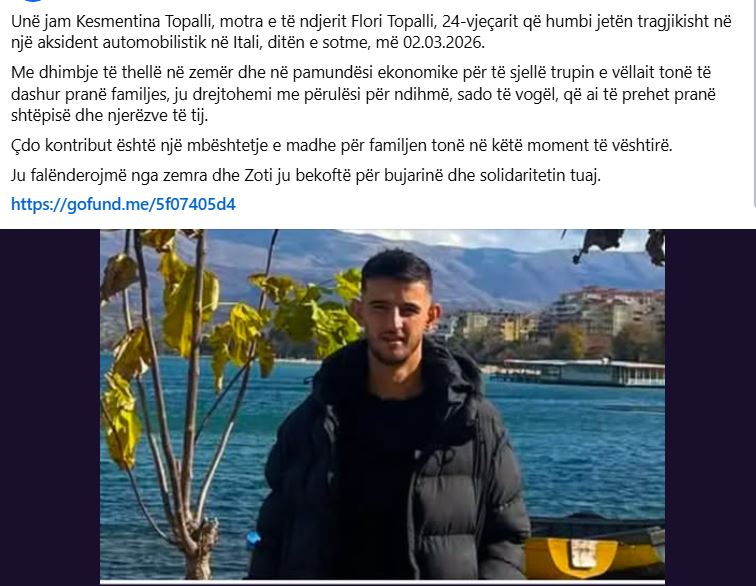 Pas aksidentit tragjik të ndodhur mëngjesin e së hënës në Itali, ku humbi jetën 24-vjeçari shqiptar Flori Topalli, familja e tij ka hapur një faqe në “GoFundMe” për të kërkuar ndihmë financiare me qëllim kthimin e trupit në Shqipëri.