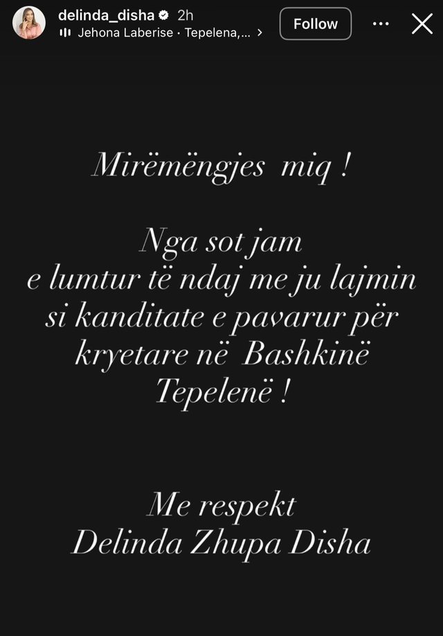 “Mirëmëngjes miq! Nga sot jam e lumtur të ndaj me ju lajmin si kandidate e pavarur për kryetare në Bashkinë Tepelenë! Me respekt, Delinda Zhupa Disha”, shkroi Disha në një postim në Instagram Story.