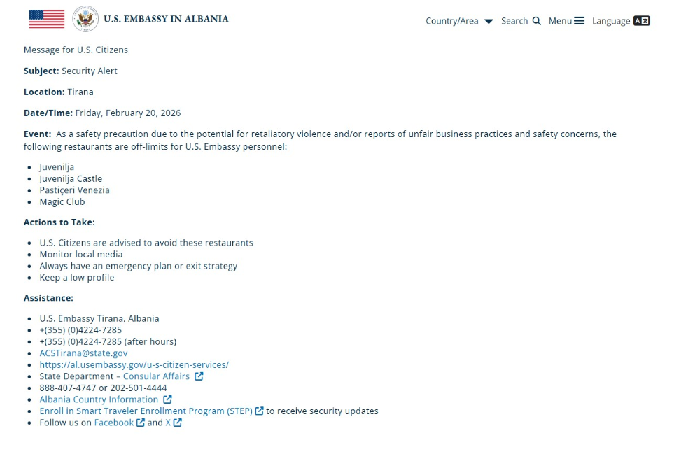 Ngjarja: Si një masë paraprake sigurie për shkak të mundësisë së dhunës hakmarrëse dhe/ose raportimeve për praktika të padrejta biznesi dhe shqetësime për sigurinë, restorantet e mëposhtme janë të ndaluara për personelin e Ambasadës Amerikane: