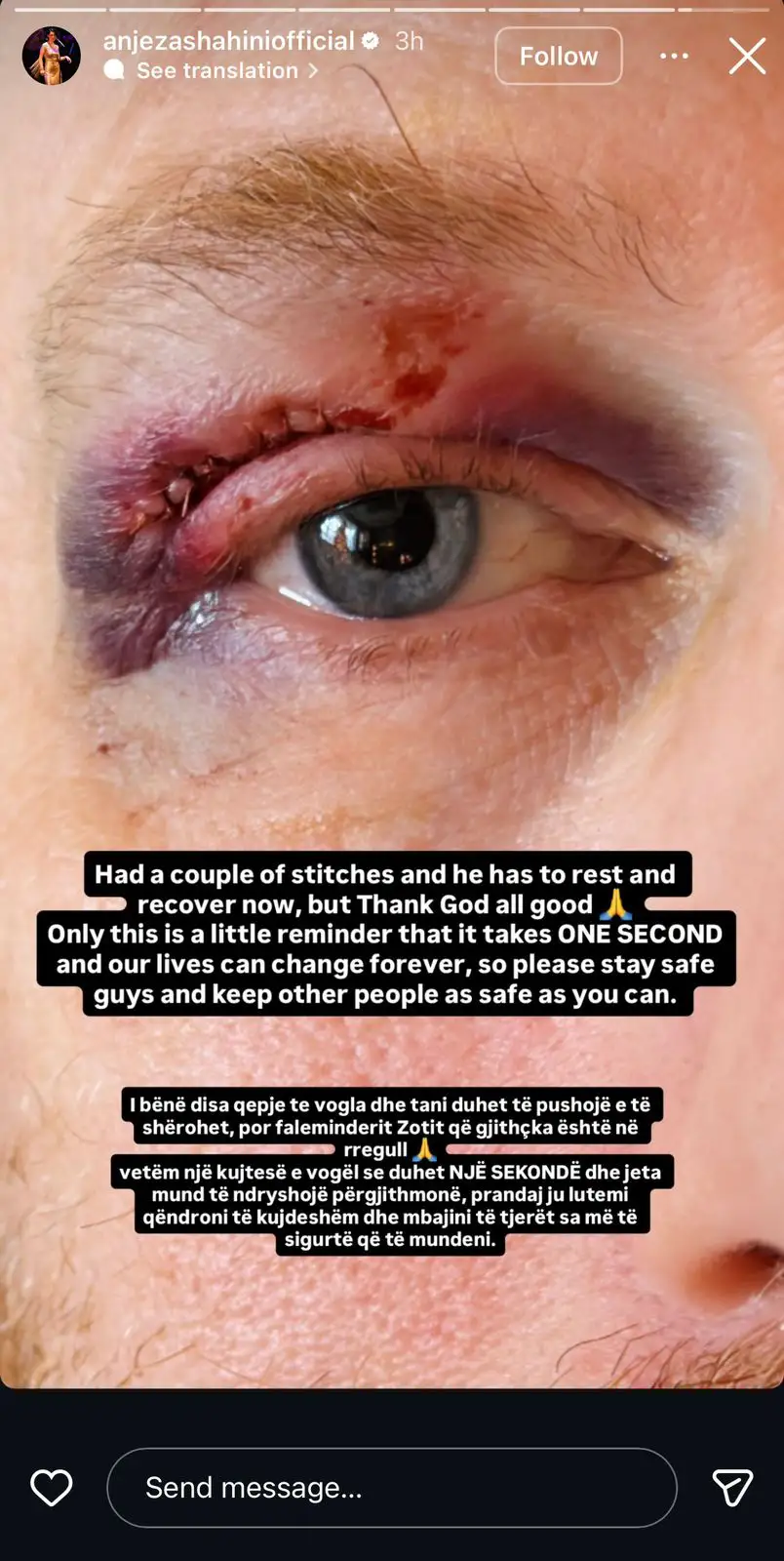 Këngëtarja e njohur Anjeza Shahini ka shqetësuar ndjekësit e saj pasi ka bërë publik një episod të rëndë që i ka ndodhur familjes. Në një Instagram Story, ajo publikoi një foto të bashkëshortit të saj, i cili shfaqej me sy të lënduar dhe të mbuluar me gjak, pas një aksidenti të befasishëm në orët e para të mëngjesit.