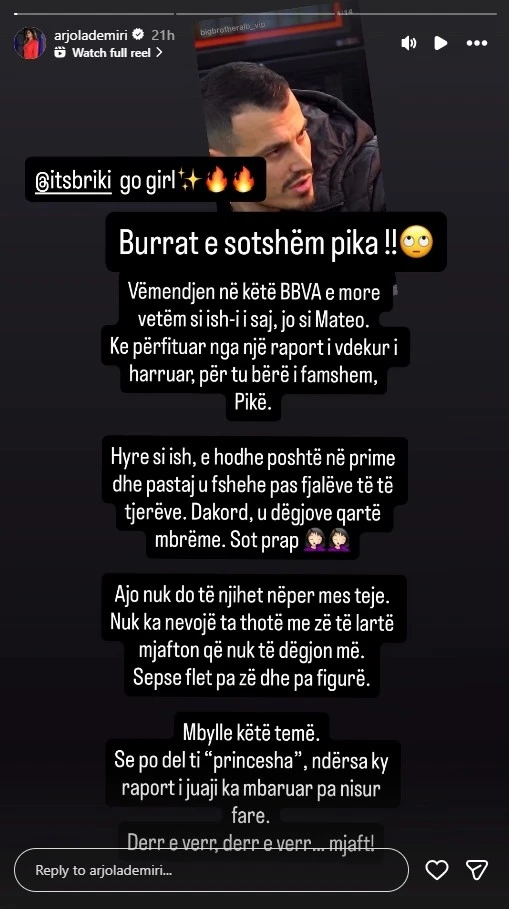 Ish-banorja e Big Brother VIP Albania 1, aktorja Arjola Demiri, ka reaguar hapur ndaj konkurrentit të këtij edicioni, Mateo Borri, pas deklaratave të tij të vazhdueshme për Brikenën. Përmes një postimi në rrjetet sociale, Arjola ka publikuar një video ku Mateo fliste sërish për raportin e tij me Brikenën, duke theksuar njohjen jashtë shtëpisë, çka nxiti reagimin e fortë të aktores tropojane.