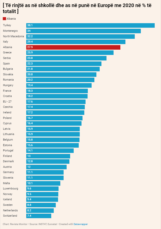 Duke e krahasuar me një renditje të Eurostat, Shqipëria është katërta, pas Turqisë, Malit të Zi, Maqedonisë së Veriut dhe Italisë, me përqindjen më të lartë të të rinjve që as nuk punojnë dhe as nuk mësojnë dhe as nuk janë në ndonjë trajnim (shih grafikun).