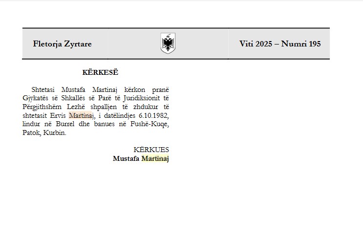 Shtetasi Mustafa Martinaj, kërkon pranë Gjykatës së Shkallës së Parë të Juridiksionit të Përgjithshëm Lezhë shpalljen tëzhdukurtë shtetasit Ervis Martinaj i datëlindjes 6.10.1982, lindur në Burrel dhe banues në Fushë-Kuqe, Patok, Kurbin.