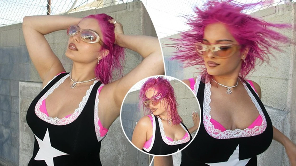 Me flokët e saj të ngjyrosura në një nuancë rozë të ndezur dhe një veshje që përfshin detaje si ngjyrat e ndritshme dhe dizajnin modern, ajo ka shpërndarë një atmosferë të freskët dhe të guximshme.