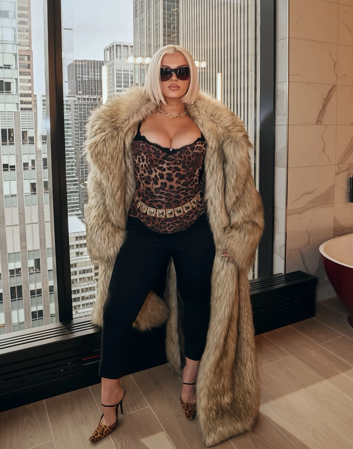 Në fotografi, këngëtarja shqiptaro-amerikane shfaqet me një trupore me motive leopardi të kombinuar me pantallona të zeza elegante dhe taka me të njëjtin motiv, ndërsa pamjen e kompleton me aksesorë të artë dhe një pallto të gjatë me gëzof.
