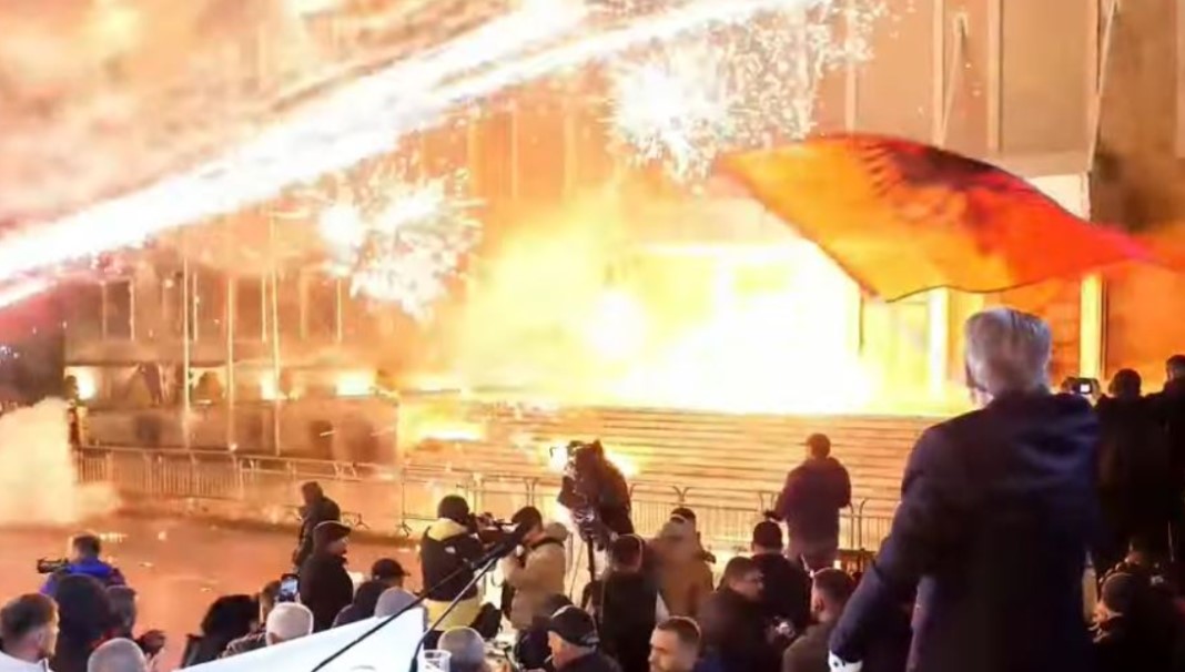 Kordoni i policisë qëndronte rreth godinës së kryeministrisë, ndërsa një autobot me ujë ndërhyri për të shuar zjarrin dhe për të shpërndarë protestuesit.