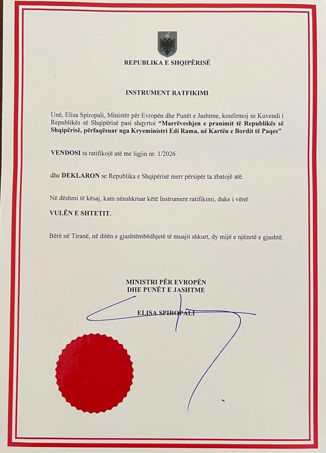Sot, Shqipëria depozitoi pranë Qeverisë së Shteteve të Bashkuara të Amerikës origjinalin e Instrumentit të Ratifikimit të “Marrëveshjes për pranimin e Republikës së Shqipërisë, përfaqësuar nga Kryeministri Edi Rama, në Kartën e Bordit të Paqes”.