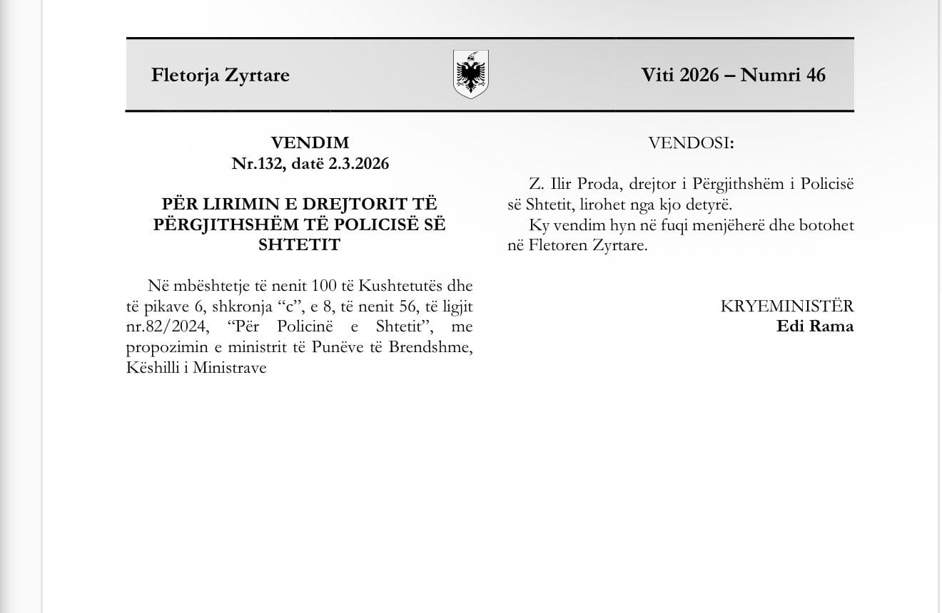 Është botuar në Fletoren Zyrtare vendimi për lirimin nga detyra të drejtorit të Përgjithshëm të Policisë së Shtetit, Ilir Proda.