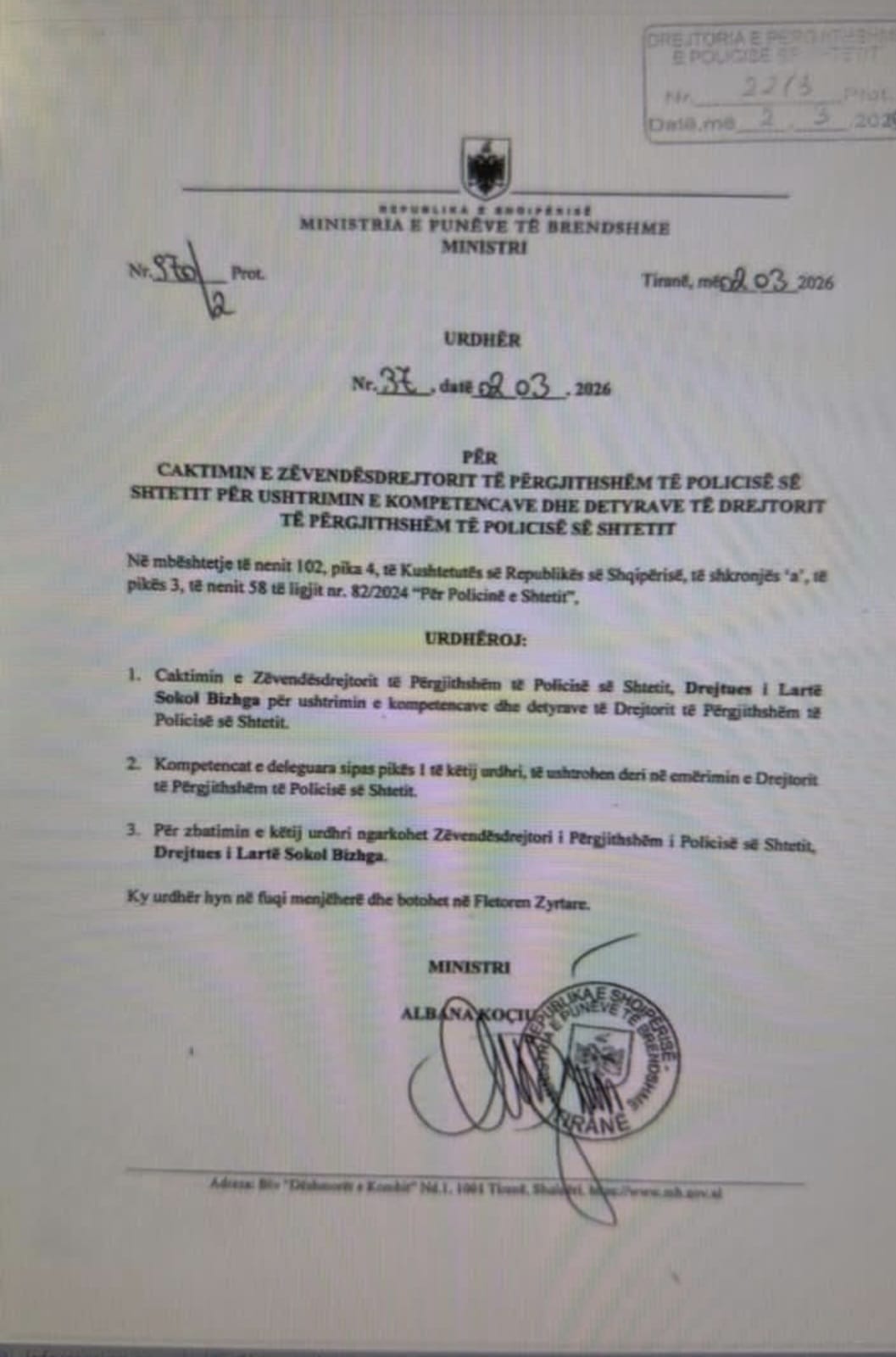 Po ashtu, është publikuar edhe vendimi i ministres së Brendshme, Albana Koçiu për emërimin si drejtues i komanduar i Policisë së Shtetit, i Sokol Bizhgës.