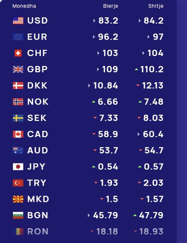 Për kursin e monedhave të tjera shihni tabelën e mëposhtme: