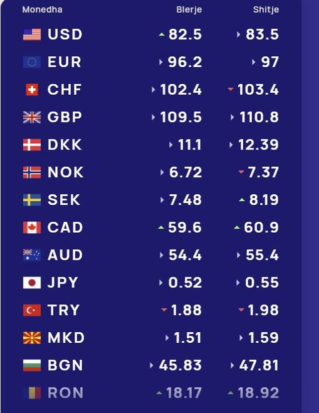 Për kursin e monedhave të tjera shihni tabelën e mëposhtme: