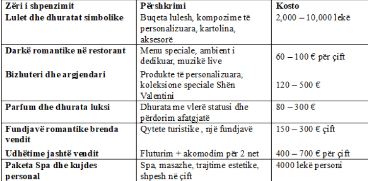Për restorantet me një reputacion të njohur, çmimi mund të arrijë deri në 200 euro për çift. Në qytetet si Tiranë, Durrës dhe Vlorë, ku turizmi dhe aktivitetet janë më të pranishme, oferta e restoranteve dhe hoteleve që ofrojnë paketat speciale është më e lartë.