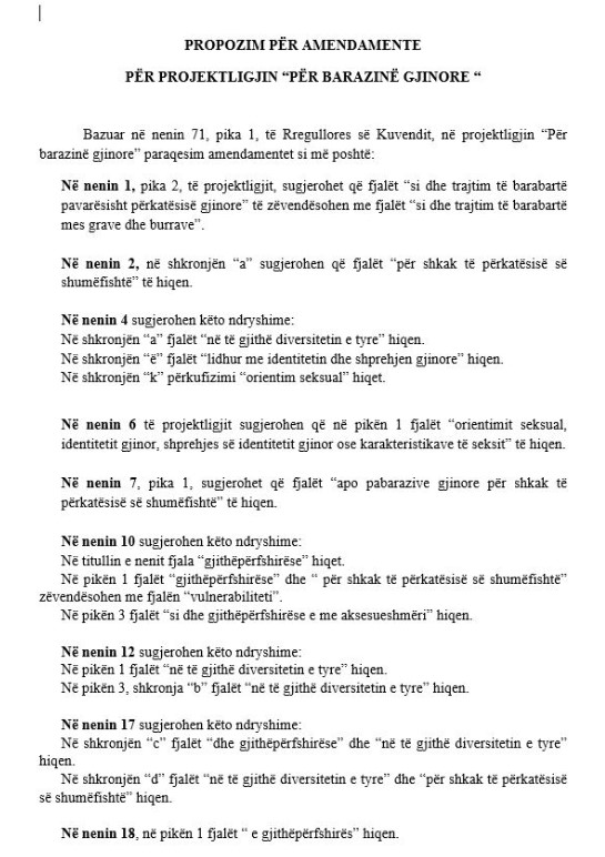 Sipas gazetarit Ergys Gjençaj, socialistët kanë dorëzuar në Kuvend 22 amendamente të reja për projektligjin e Barazisë Gjinore, ku përmenden vetëm dy kategori gjinia, burrë dhe grua, duke përjashtuar mundësinë për një njohje të zyrtarizuar të gjinisë së tretë.