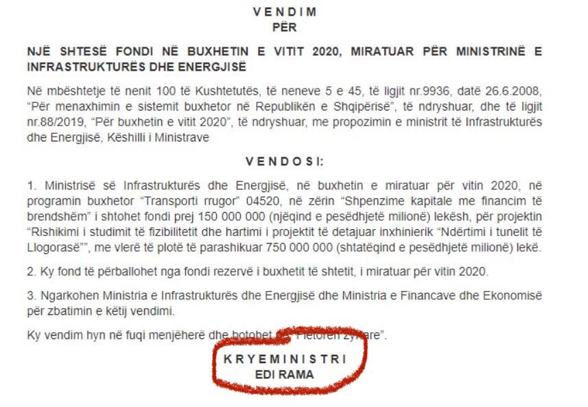 Po ashtu, ish-kryeministri tha se Rama jo vetëm e ka miratuar projektin, por edhe ka shtuar fondin me 150 milionë lekë për studimin e fizibilitetit, duke i marrë paratë nga fondi rezervë i Këshillit të Ministrave.