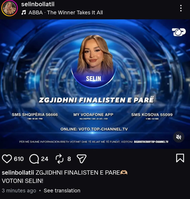 Ata kanë ndarë foton me kodet e votimit për nominimin kokë më kokë me Brikenën, duke i bërë thirrje publikut të mbështesë vajzën e tyre. “Zgjidhni finalisten e parë. Votoni Selin!” shkruhet në mbishkrimin e postimit, ndërsa një detaj mjaft domethënës është edhe kënga e zgjedhur në sfond.