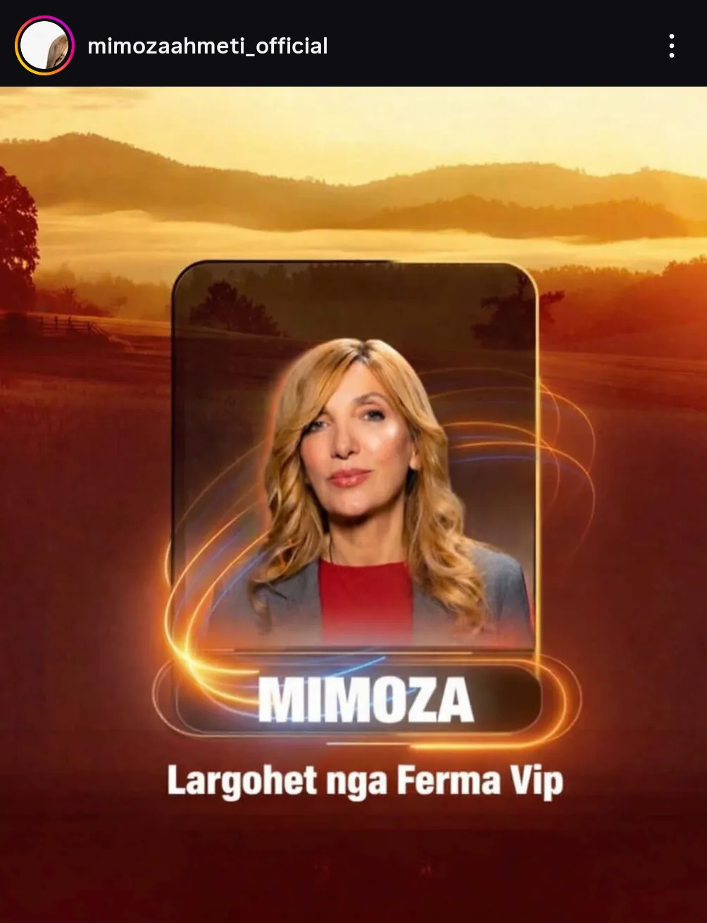 Një postim i papritur në Instagram ka shkaktuar trazira te fansat e Mimoza Ahmetit, personazhit më viral të “Ferma VIP 3”. Mëngjesin e sotëm, në llogarinë e saj zyrtare u publikua një grafikë ku shfaqej fotoja e Mimozës me mbishkrimin: “MIMOZA Largohet nga Ferma VIP”, duke ngritur menjëherë dyshime mbi përfundimin e rrugëtimit të saj televiziv në mënyrë kaq befasuese.