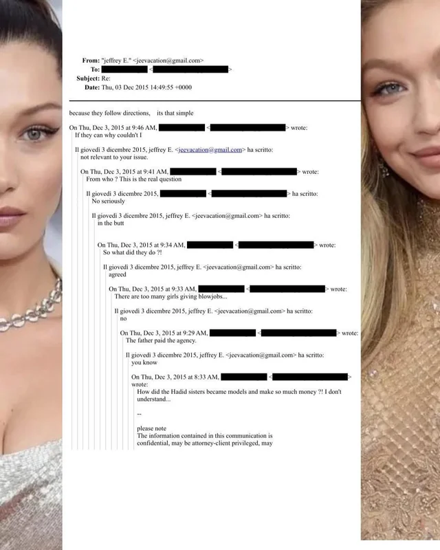 Në emailin e datës 3 dhjetor 2015, një person i paidentifikuar, që besohet të ketë lidhje me industrinë e modelingut, e pyet Epstein: “Si u bënë motrat Hadid modele dhe fitojnë kaq shumë para? Nuk e kuptoj!” Epstein i përgjigjet: “Ti e di”, duke hedhur poshtë pretendimin e telefonuesit se “babai i tyre pagoi agjencinë e modelimit”.
