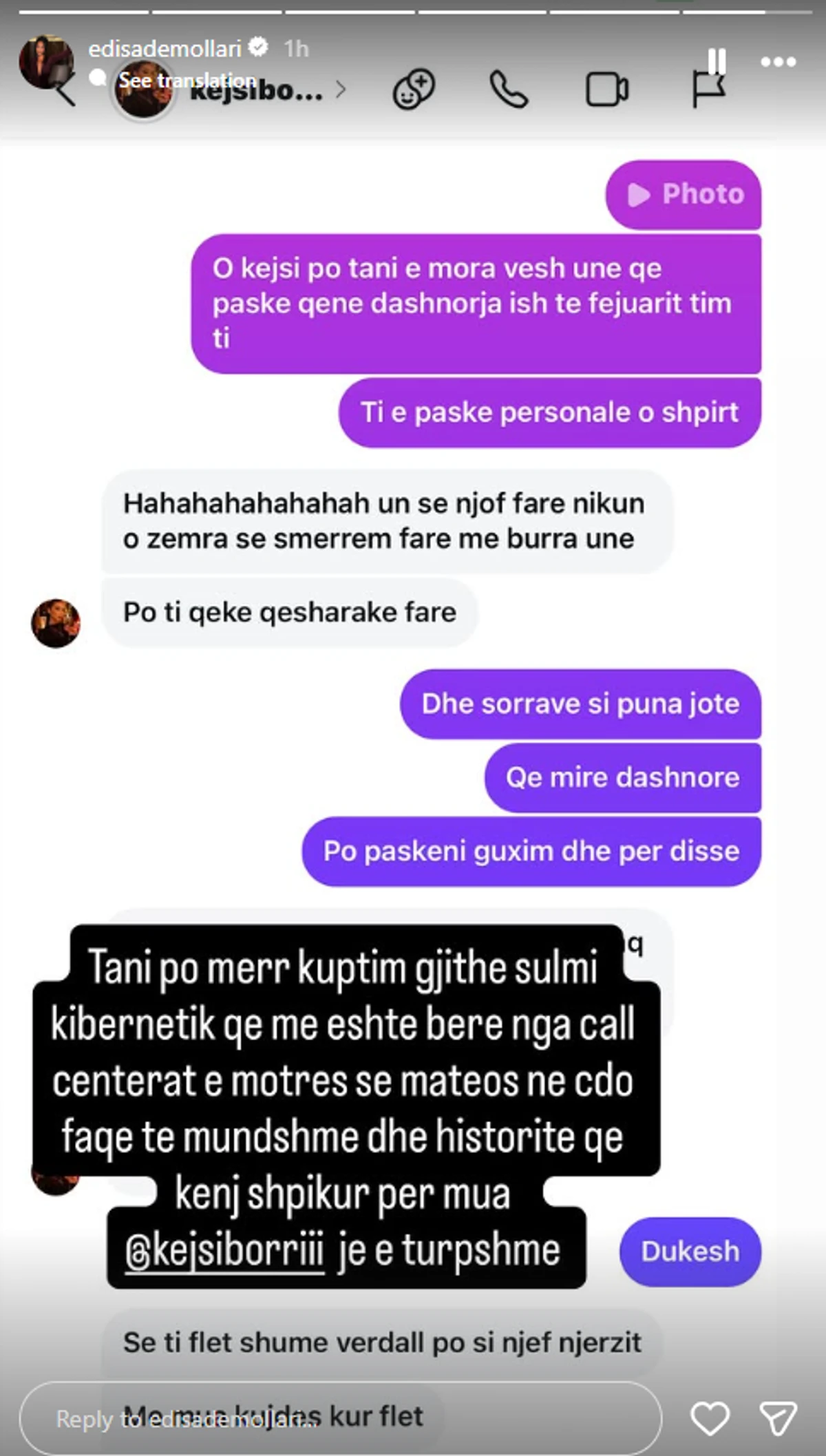 Edisa: Tani po merr kuptim gjithë sulmi kibernetik që më është bërë nga Call Centerat e motrës së Mateos në çdo faqe të mundshme dhe historitë që keni shpikur për mua. Kejsi Borri je e turpshme.
