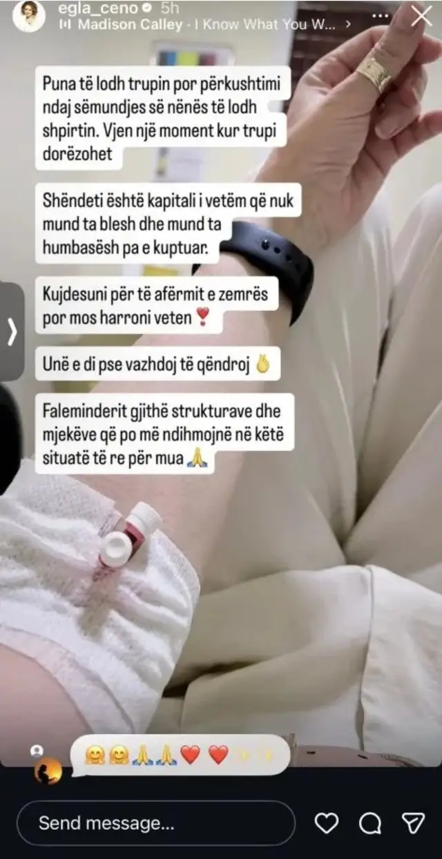 Në imazhin e publikuar, ajo shfaqet në një ambient spitalor, me serum në krah, një detaj që sugjeron situatën delikate që po përjeton. Përmes disa rreshtave të sinqertë, aktorja rrëfen lodhjen jo vetëm fizike, por edhe emocionale që vjen nga përkushtimi ndaj një personi të dashur që po përballet me sëmundjen.