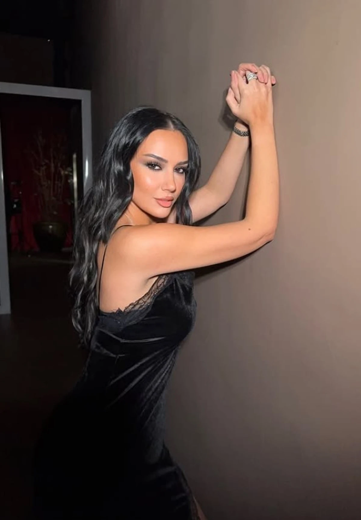 Flokët e gjatë e të zinj, të stiluar me onde të buta, i japin një prekje glamuroze, ndërsa grimi i realizuar me tone neutrale dhe theks në sy, shfaq bukurinë e saj klasike.