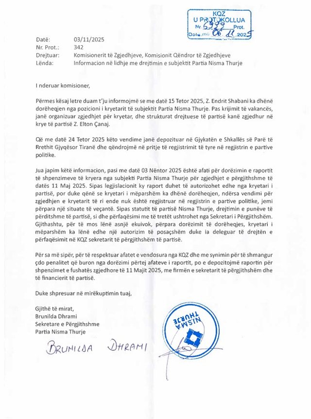 Endrit Shabani ka dorëzuar zyrtarisht dorëheqjen nga posti i kryetarit të Nismës Thurje. Lajmi është konfirmuar përmes një njoftimi zyrtar që kjo forcë politike i ka dërguar Komisionit Qendror të Zgjedhjeve (KQZ). Pas dorëheqjes së Shabanit, strukturat drejtuese të Nismës Thurje kanë zhvilluar zgjedhje të brendshme, ku Elton Çanaj është emëruar në krye të partisë.