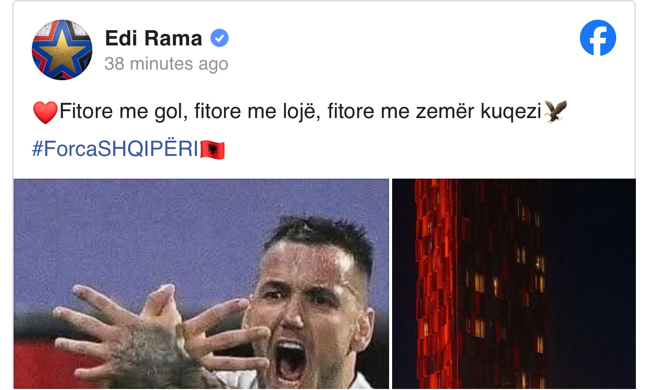 Fitorja e kombëtares në Serbi, reagon Rama: Fitore me zemër kuqezi “Fitore me gol, fitore me lojë, fitore me zemër kuqezi”, shkruan Rama. Shtuar më 11.10.2025 23:33 Tags: rama, Serbi VIDEO/ Fjalim i Sylvinhos dhe bashkimi i Dukës, festë e çmendur kuqezi në dhomat e zhveshjes pas fitores me Serbinë: O sa mirë me qenë shqiptar Osmani: Shqiponjat fluturojnë lart! Urimi unik i Presidentes së Kosovës “Kosova është Serbi”/ Thirrje raciste nga tifozët serbë në ndeshjen në Leskovac U shfaq në shkollë me armë, policia identifikon 15-vjeçarin: E kishte lodër SERBI-SHQIPËRI/ Dy raste të rrezikshme në portën kuqezi, serbët kërkojnë penallti për prekje me… gjoks Këngë, valle dhe hare/ Tirana vishet kuqezi, tifozët ndezin atmosferën në sheshin “Italia” (Video) SERBI-SHQIPËRI/ Shkelmohet topi i parë në Leskovc, kuqezinjtë kërkojnë historinë VIDEO/ Pak para ndeshjes ndaj Serbisë, tifozët “ndezin” atmosferën në kryeqytet