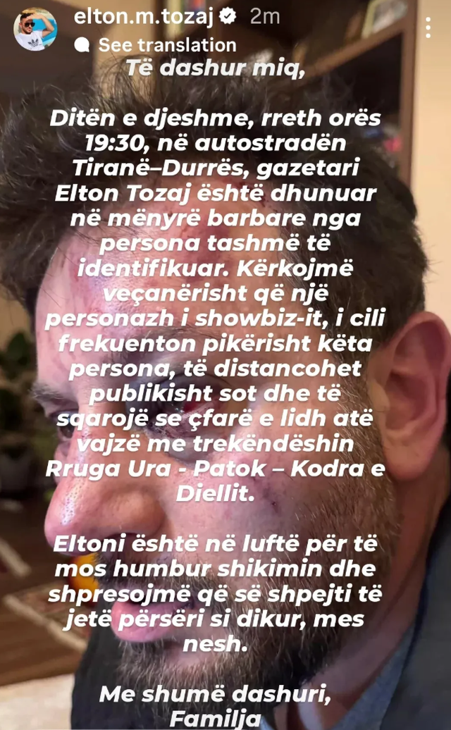 Gazetari dhe ish-banori i “Big Brother Albania”, Elton Tozaj, ka rënë pre e një dhune barbare që e ka lënë me dëmtime të rënda fizike, duke rrezikuar seriozisht shikimin e tij.