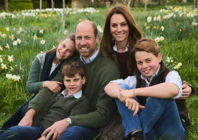 Imazhi tregon William dhe Catherine të ulur në bar të harlisur të rrethuar nga narcisë pranverore, së bashku me fëmijët e tyre Princi George, Princesha Charlotte dhe Princi Louis.