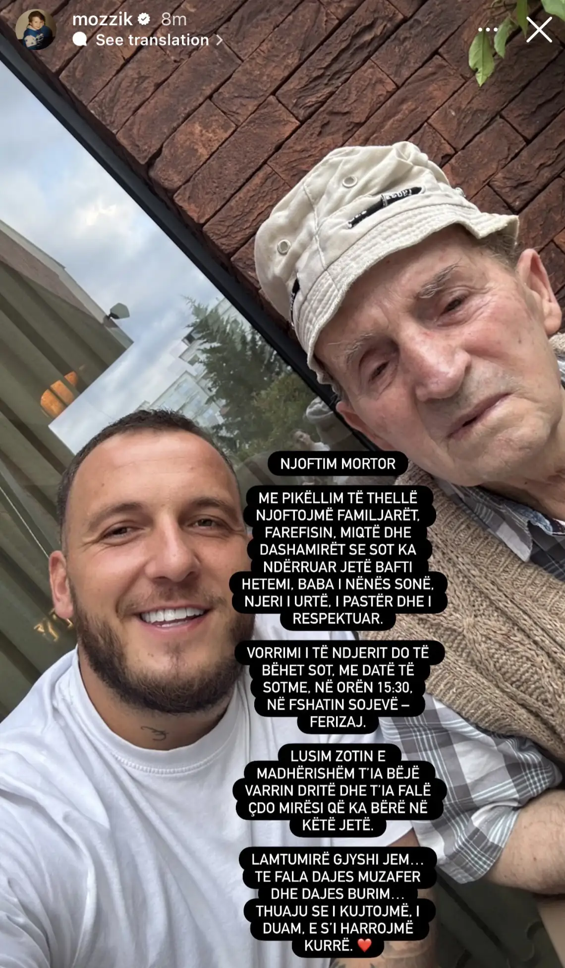 Mozzik publikoi një foto të vjetër me gjyshin, të shoqëruar me një njoftim mortor, ku me dhimbje njoftonte familjarët, miqtë dhe të afërmit se Bafti Hetemi, babai i nënës së tyre, ishte ndarë nga jeta. Ai e përshkroi të ndjerin si “njeri të urtë, të pastër dhe të respektuar”, ndërsa uroi që Zoti ta shpërblejë për çdo të mirë që ka bërë gjatë jetës së tij.