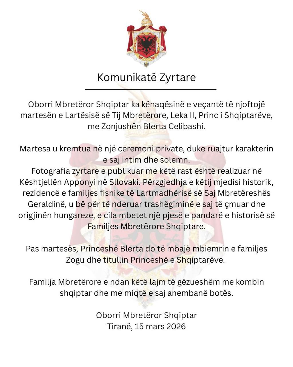 Njoftimi është bërë publik nga Oborri Mbretëror Shqiptar në Tiranë, më 15 mars 2026.