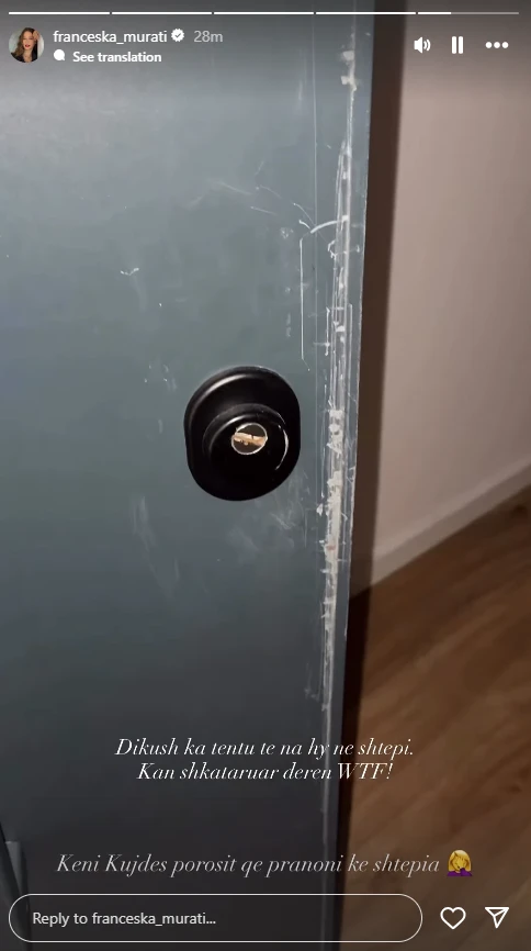 Përmes një postimi në rrjetet sociale, Françeska ka ndarë me ndjekësit një video ku tregon derën e dëmtuar të shtëpisë dhe gjurmët e tentativës për thyerje. “Dikush ka tentuar të na hyjë në shtëpi.