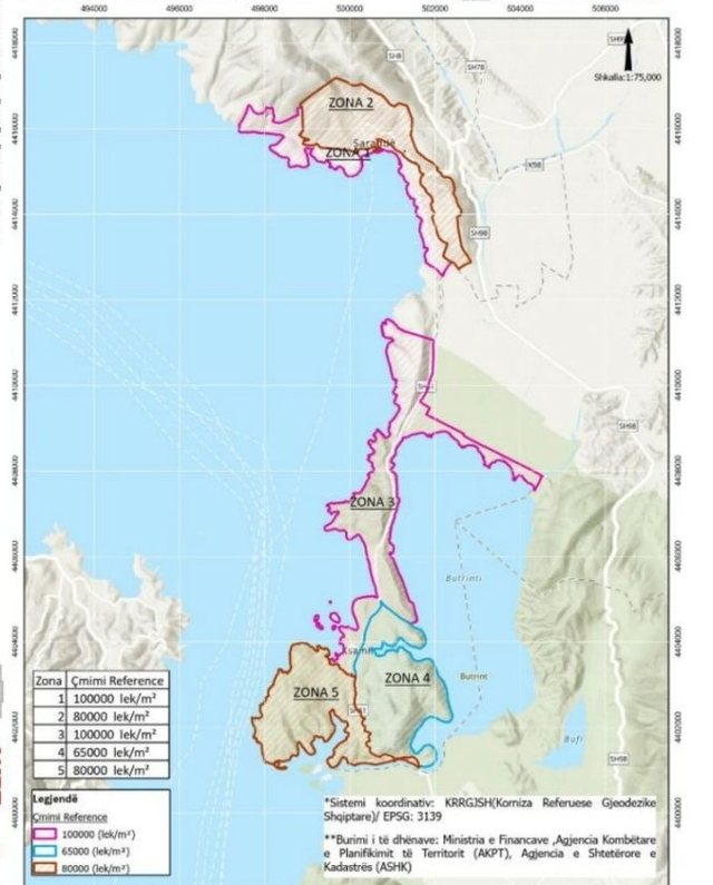 Saranda: Fshati i Ksamilit dhe vija e parë bregdetare e qytetit të Sarandës do të kenë një çmim reference prej 100,000 lekë/m². Zonat e tjera rurale përreth, si Gjashta dhe Metoqi, do të vlerësohen me 56,000 lekë/m².