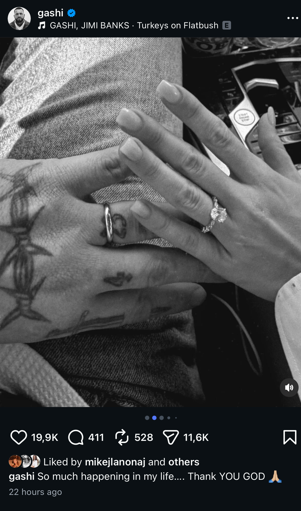 Në imazhet e fundit të publikuara, çifti shfaqet shumë i afërt dhe i lumtur, duke reflektuar një raport të konsoliduar dhe plot ndjenja. Fotot, të realizuara në një ambient të qetë e romantik, i tregojnë të dy teksa shkëmbejnë puthje, ndërsa në duart e partneres bien në sy edhe lulet, një detaj që e bën skenën edhe më të ëmbël. Po ashtu, vëmendje të veçantë ka marrë edhe unaza e fejesës, e cila është kthyer në një nga detajet më të komentuara nga ndjekësit.