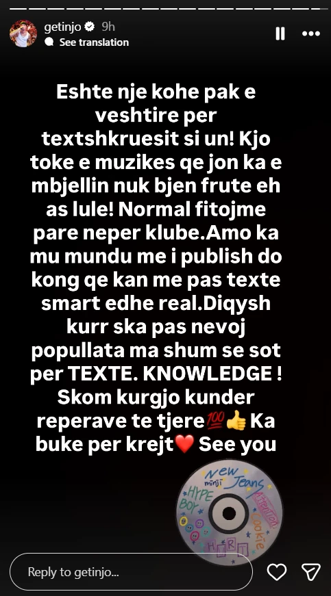 Reperi i njohur shqiptar, Getinjo, ka ndarë së fundmi mendimet e tij mbi situatën e skenës muzikore dhe vështirësitë që përballojnë artistët që fokusohen te tekstet me përmbajtje të thellë. Në një postim në rrjetet sociale, ai theksoi se nuk është gjithmonë e lehtë të gjesh hapësirë për krijimet që kanë një mesazh të fortë, duke e përshkruar këtë periudhë si “pak e vështirë për tekstshkruesit si unë”.