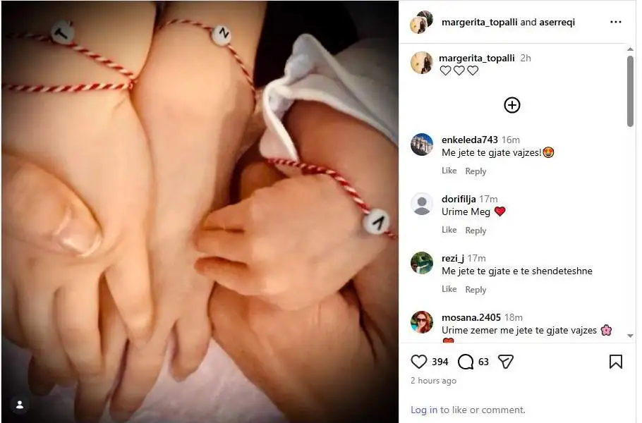 Familja e ish-kryetares së Kuvendit të Shqipërisë, Jozefina Topalli, ka shënuar një moment të veçantë, pasi vajza e saj, Margerita, është bërë nënë për herë të tretë. Lajmi i bukur është ndarë nga vetë Margerita përmes një postimi në rrjetin social Instagram, ku ajo ka publikuar një fotografi simbolike familjare. Në imazh shfaqen duart e anëtarëve të familjes të bashkuara, të zbukuruara me byzylykë me fije të kuqe dhe të bardha, duke mos zgjedhur qe te ndaje me shume detaje, apo portretin e te vogles.
