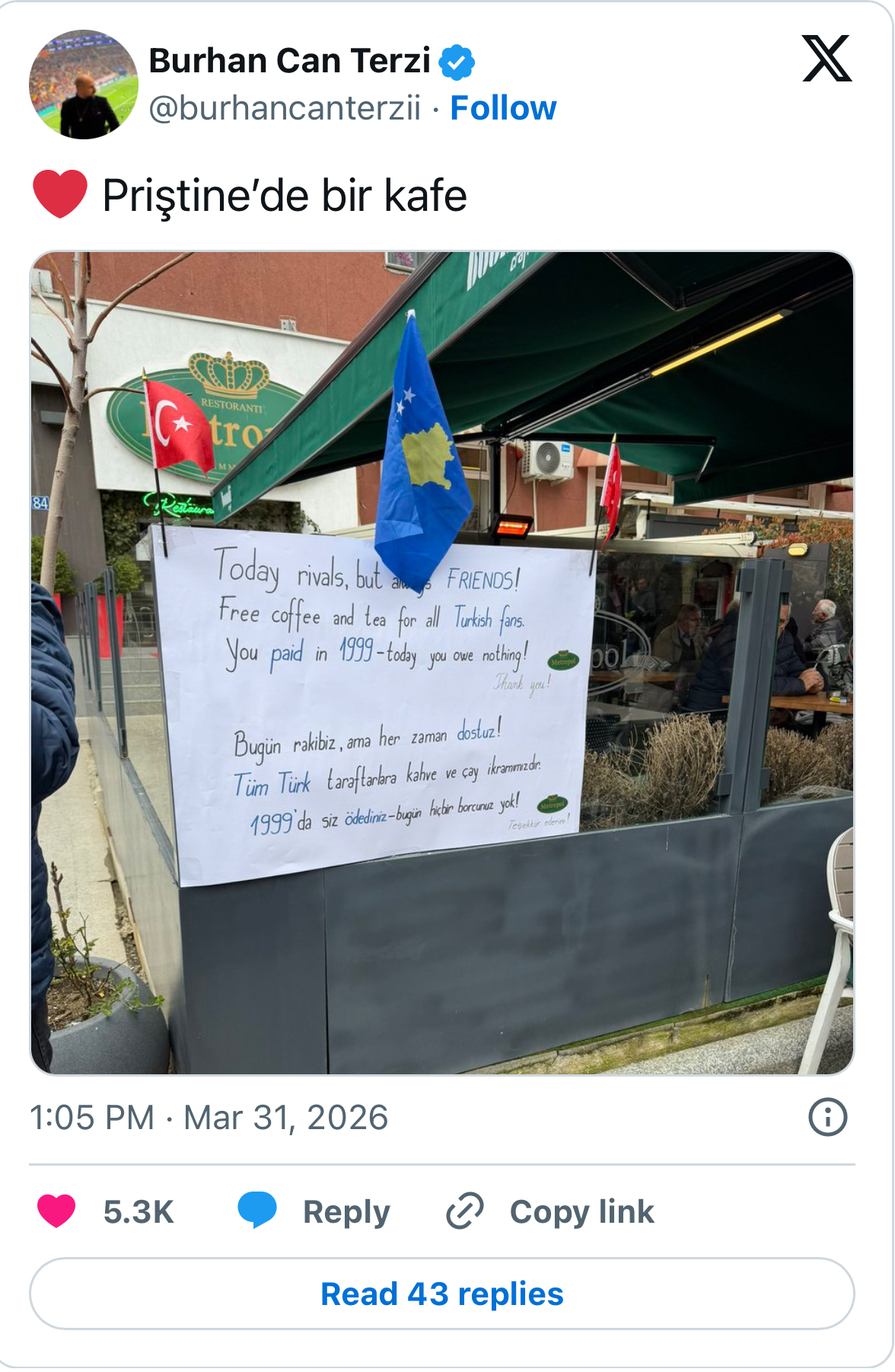 Në hyrje të kafenesë është vendosur një letër me një mesazh domethënës: “Sot rivalë, por gjithmonë miq! Kafe dhe çaj falas për të gjithë tifozët turq. Ju e paguat më 1999 – sot nuk keni asnjë detyrim”.