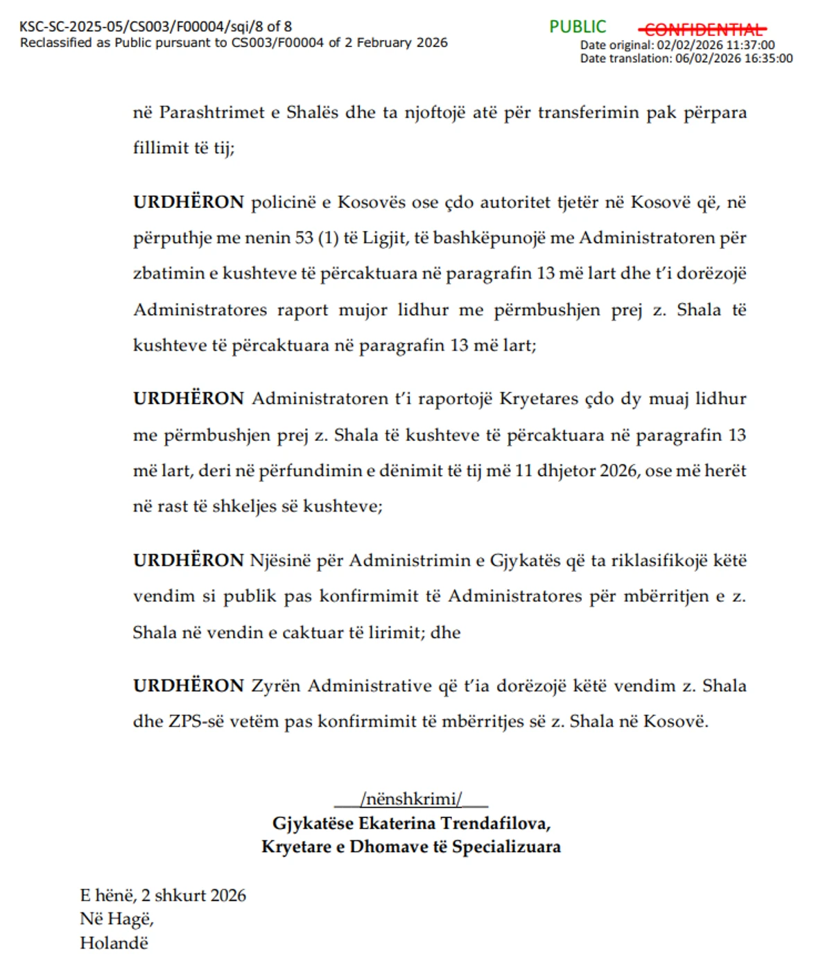 Sipas njoftimit zyrtar, më 2 shkurt 2026, Kryetarja e DHSK-së, gjykatësja Ekaterina Trendafilova, vendosi të modifikojë dënimin e Shalës, duke përcaktuar kushte që do të zbatohen për pjesën e mbetur nga dënimi prej tre vjetësh.
