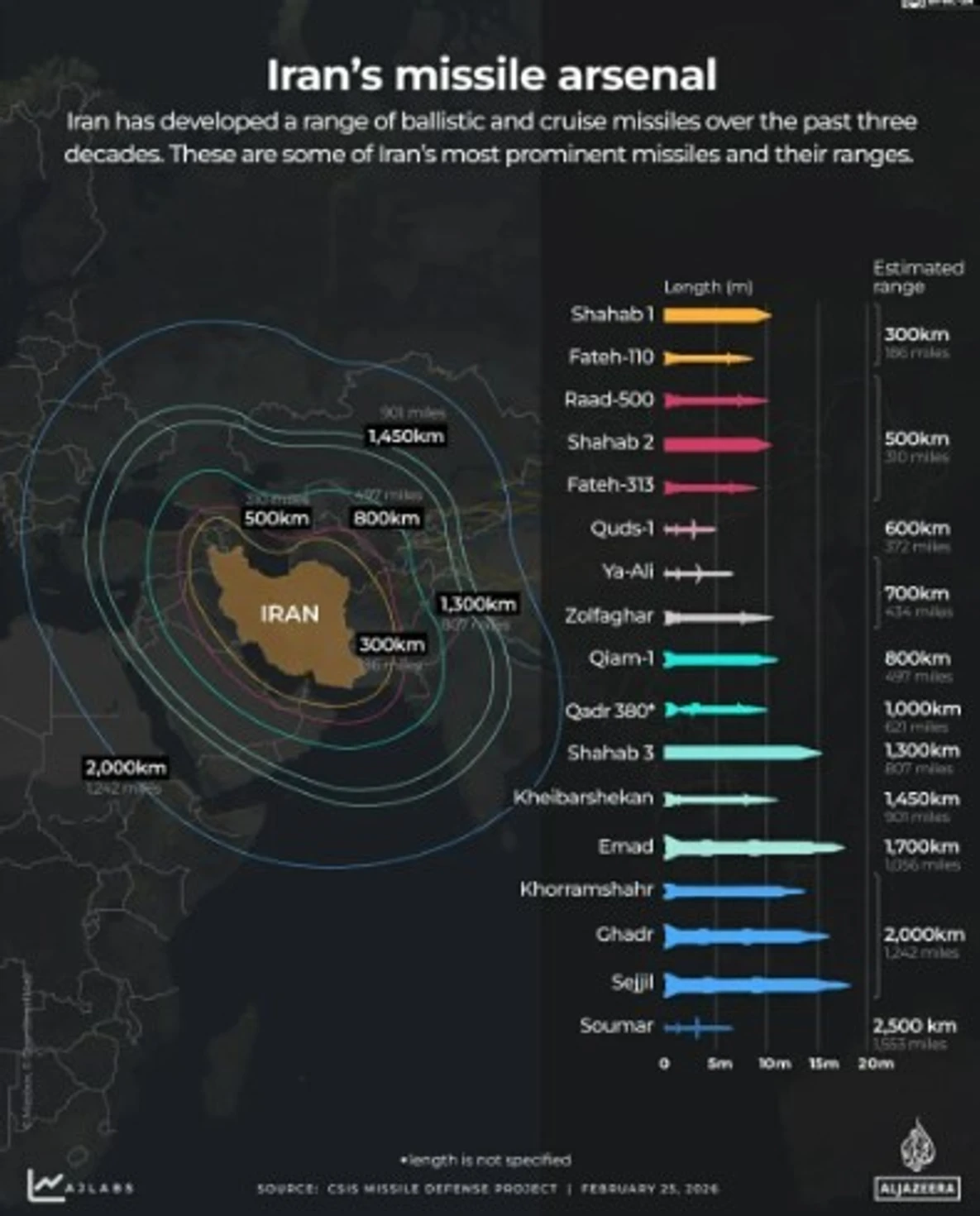 Më të rrezikshme konsiderohen raketat balistike me mesatare dhe të gjata, si Shahab-3 dhe Ghadr-110, të cilat sipas vlerësimeve mund të arrijnë deri në rreth 2000 kilometra.
