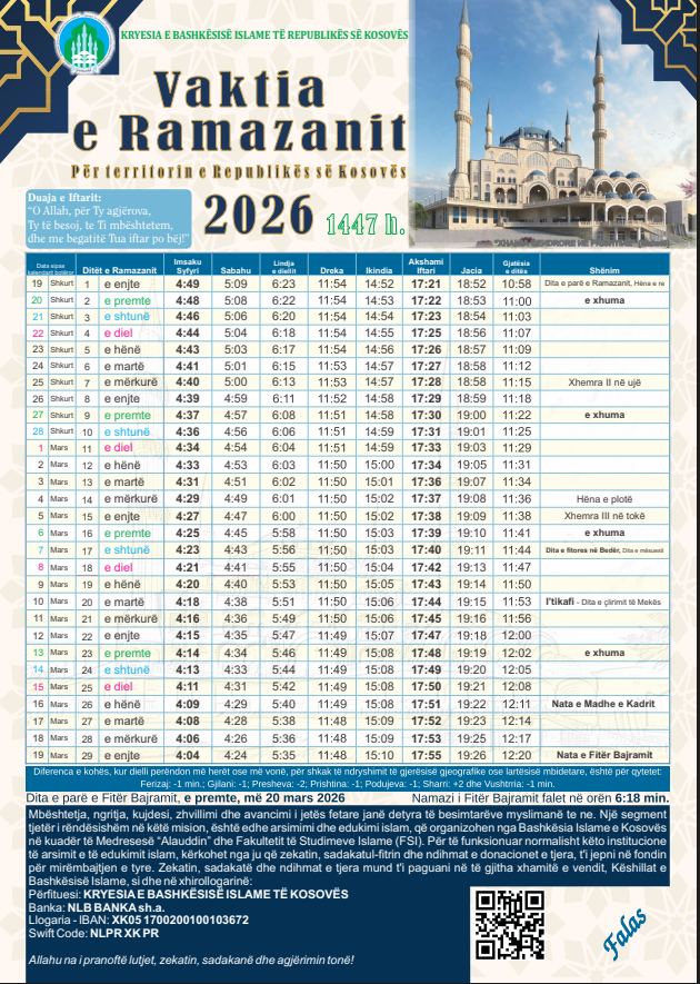 Oraret e faljes dhe Agjërimit (Vaktia) për Kosovë (Bashkësia Islame e Kosovës):