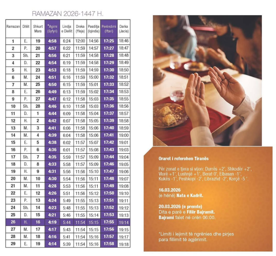 Më poshtë ju sjellim kalendarin e muajit te Ramazanit për Shqipërinë, Kosovën dhe Maqedoninë e Veriut!