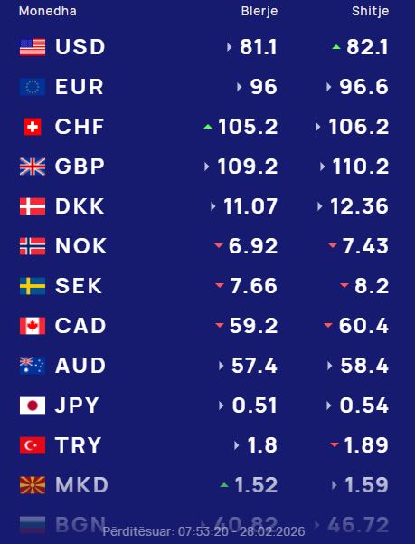 Më poshtë, po sjellim të dhënat e këmbimin valutor, për të gjitha monedhat e huaja: