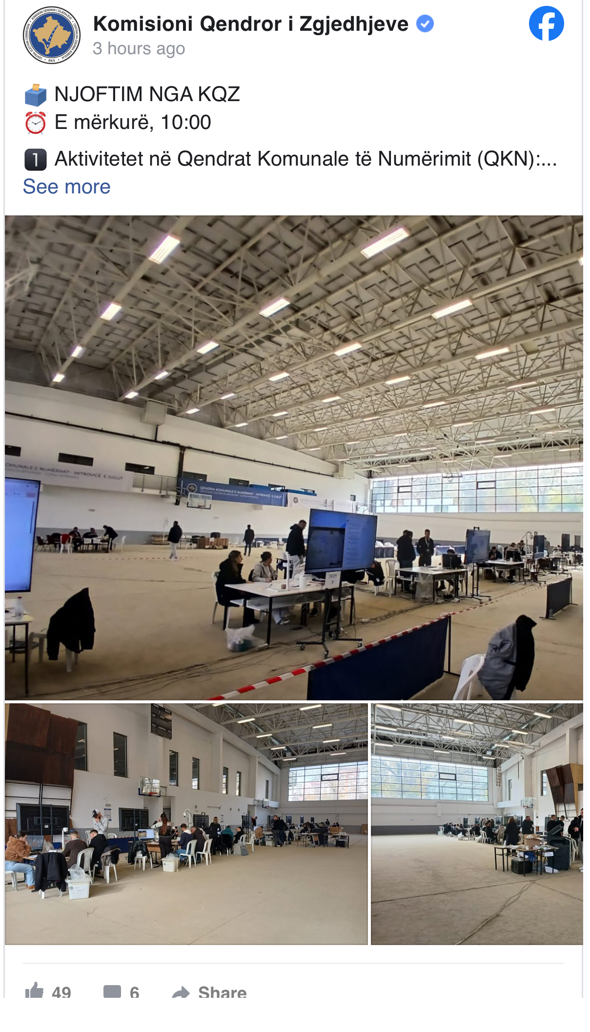 Një ditë më herët, të martën, është përmbyllur verifikimi i rezultateve në 17 Qendra Komunale të Numërimit, përfshirë komunat: Junik, Mamushë, Kllokot, Obiliq, Klinë, Vushtrri, Dragash, Rahovec, Gjakovë, Gjilan, Fushë Kosovë, Suharekë, Kaçanik, Prishtinë, Viti, Prizren dhe Pejë.