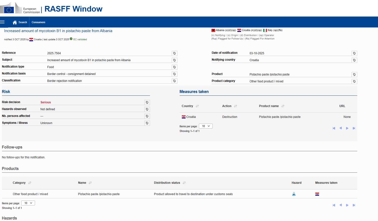 Njoftimi është bërë publik në sistemin RASFF më 3 tetor, me qëllim që edhe vendet e tjera anëtare të BE-së të ndalojnë qarkullimin e këtij produkti nëse ndodhet në tregjet e tyre.