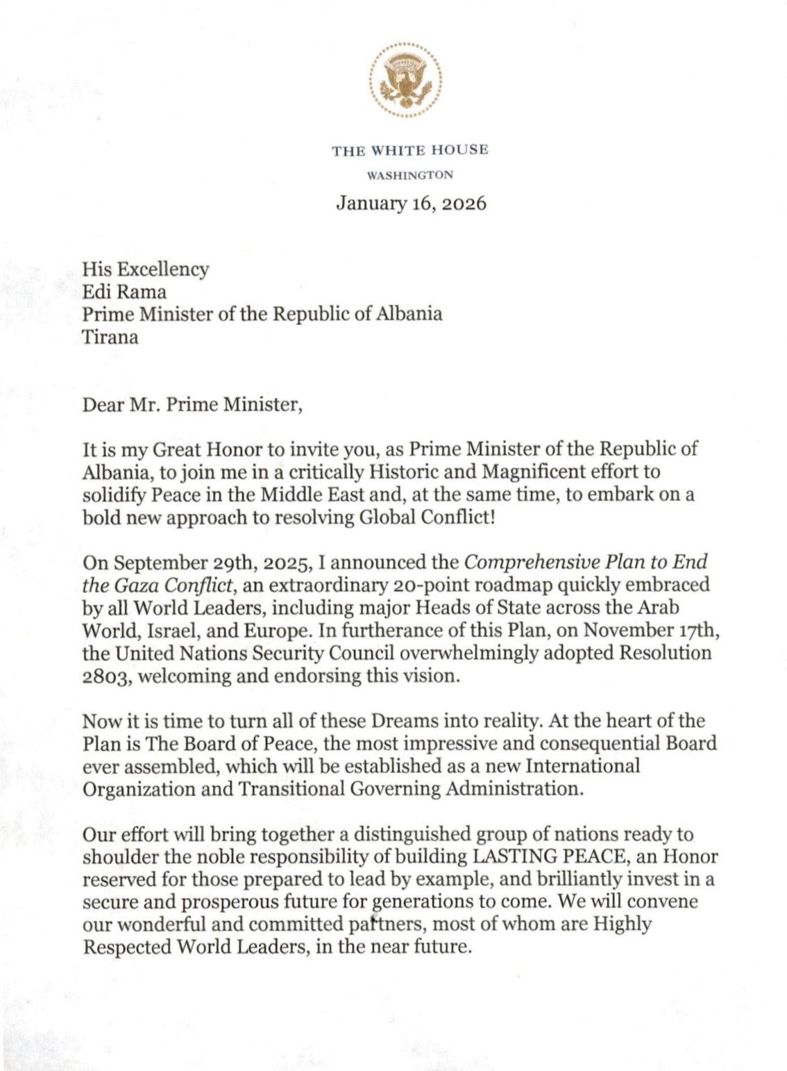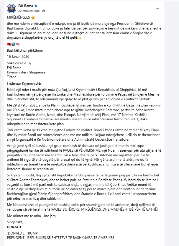 Ndërkohë, sipas letrës që mban datën 16 janar 2026, Presidenti Trump, i drejtohet Kryeministrit shqiptar me një ftesë për t’u bashkuar në atë që ai e cilëson si një “përpjekje historike dhe madhështore” për forcimin e paqes në Lindjen e Mesme dhe për një qasje të re në zgjidhjen e konflikteve globale.